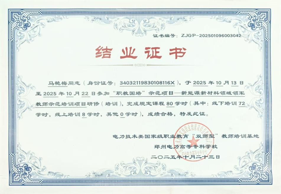 为加快“双师型”教师队伍建设,10月12日,我校选派beat365在线体育官网登录入口马艳梅老师赴郑州电力高等专科学校,参加教育部2025年“职教国培”示范项目——新能源新材料领域领军教师示范培训。