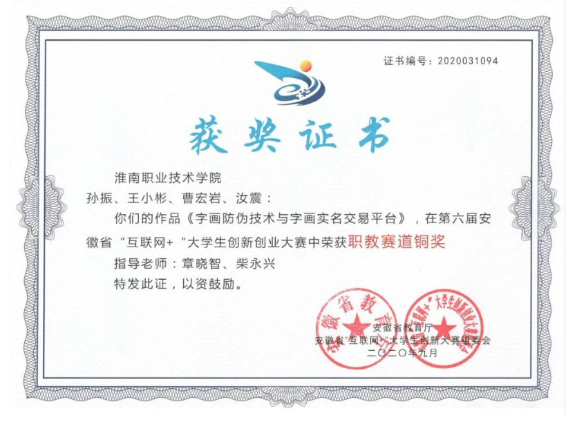 智能与电气工程学院在“建行杯”第六届中国国际“互联网+”大学生创新创业大赛选拔赛暨安徽省“互联网+”大学生创新创业大赛中喜获佳绩。学院章晓智老师和人事处柴永兴老师联合指导项目《字画防伪技术与字画实名交易平台》获得安徽省职教赛道铜奖。
