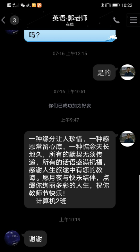 教师节当天,学生会代表为学院老师送上了精美的书签,同学们也通过各种方式向辛勤耕耘的“园丁”送去了问候和祝福:上课前集体起立向老师致敬;给老师发送祝福短信;绘制黑板报;给上课的老师送去鲜花和绿植……老师们收到学生的祝福既感动又欣慰,并教导大家要好好学习,不忘初心,将来能够报效祖国。