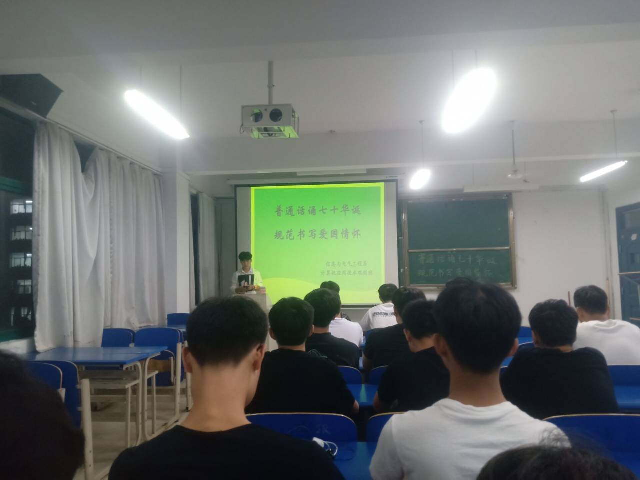 为了大力推广和规范使用国家通用语言文字,弘扬社会主义核心价值观和中华优秀传统文化,信电系近日开展了“普通话诵七十华诞,规范字书爱国情怀”系列主题活动。917日,信电系19级新生利用晚自习时间,以班级为单位开展了普通话诵读比赛,同学们积极性很高,比赛现场气氛热烈。【撰稿:蒋军摄影:刘瑞 审核:刘国华】