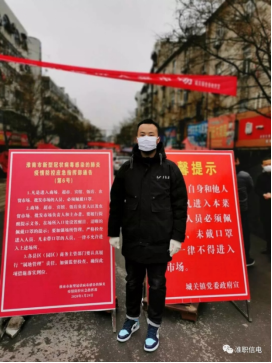 4.“我是党员,我来报到!”90后的年轻党员蔡德胜是2019级电气自动化技术专业社招班学生,在淮南市中安联合煤化有限责任公司工作。2月8日清晨,刚下夜班的蔡德胜,顾不上去医院照顾生病吊水的妻子,一大早就来到所居住的泰府名邸小区值守,并帮助社区干部悬挂疫情防范横幅、向社区居民发放防疫宣传单、为出入的小区居民测量体温等,尽心尽力做好各项防疫工作。