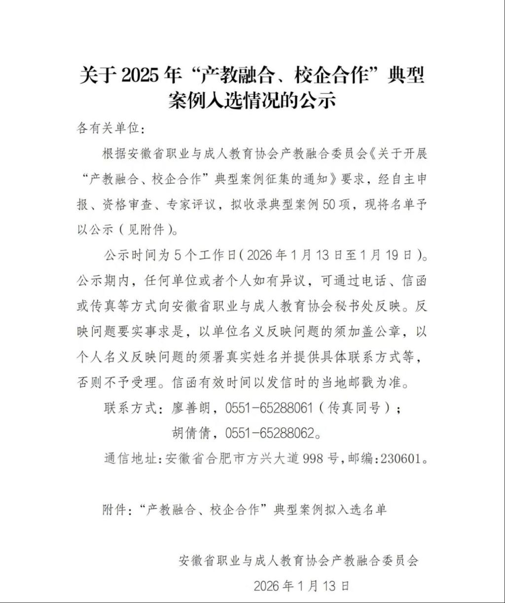 近日,安徽省职业与成人教育协会公示了2025年度“产教融合、校企合作”典型案例拟入选名单。beat365在线体育官网登录入口beat365在线体育官网登录入口联合深圳市讯方技术股份有限公司(以下简称“讯方技术”)申报的《双师驱动 多层融合:打造实战型技能人才培养模式》案例成功进入拟入选名单。