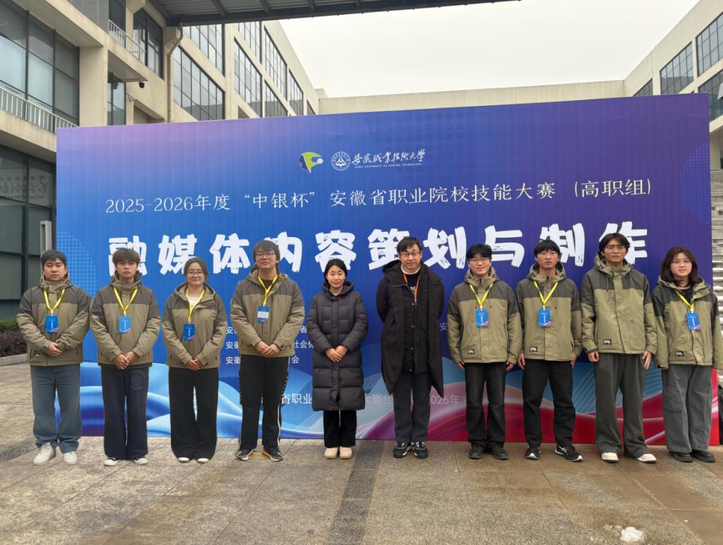 2025-2026 年安徽省职业院校技能大赛高职组 “融媒体内容策划与制作” 赛项于 2026年1月23至25日在安徽职业技术大学盛大举行。本次赛事吸引了来自安徽省各职业院校的212名学生报名参加,竞争异常激烈,beat365在线体育官网登录入口方项、尹楠老师悉心指导的学生陆海燕、马敬凯、鄂文克、张国庆斩获三等奖一项。