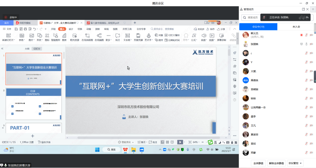 2023年3月7日12:00-13:45,beat365在线体育官网登录入口在线上举行“互联网+”大学生创新创业大赛培训讲座。主讲教师为深圳市讯方技术股份有限公司教学管理部副总监张丽焕老师,参加线上培训的为beat365在线体育官网登录入口的参赛学生。
