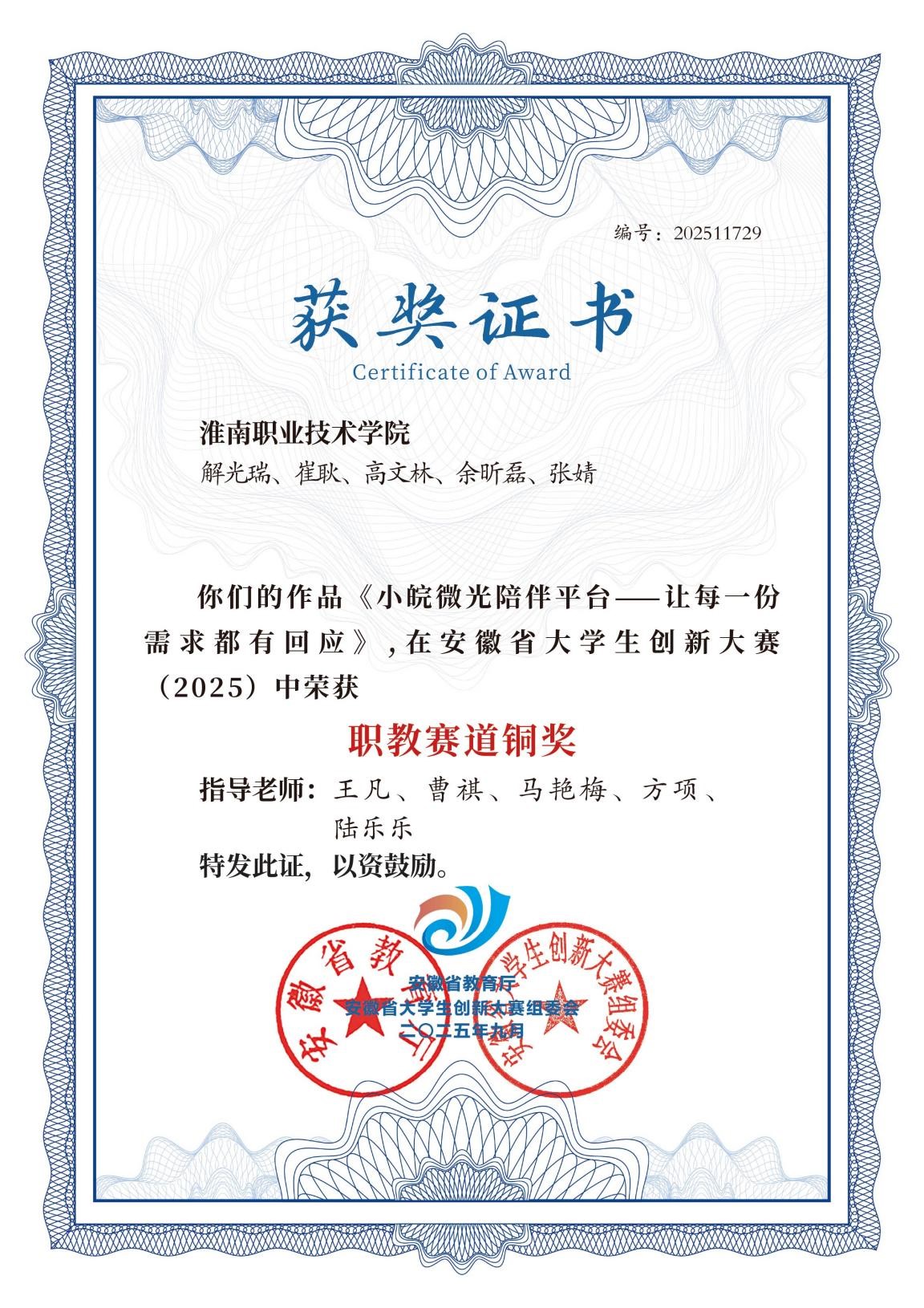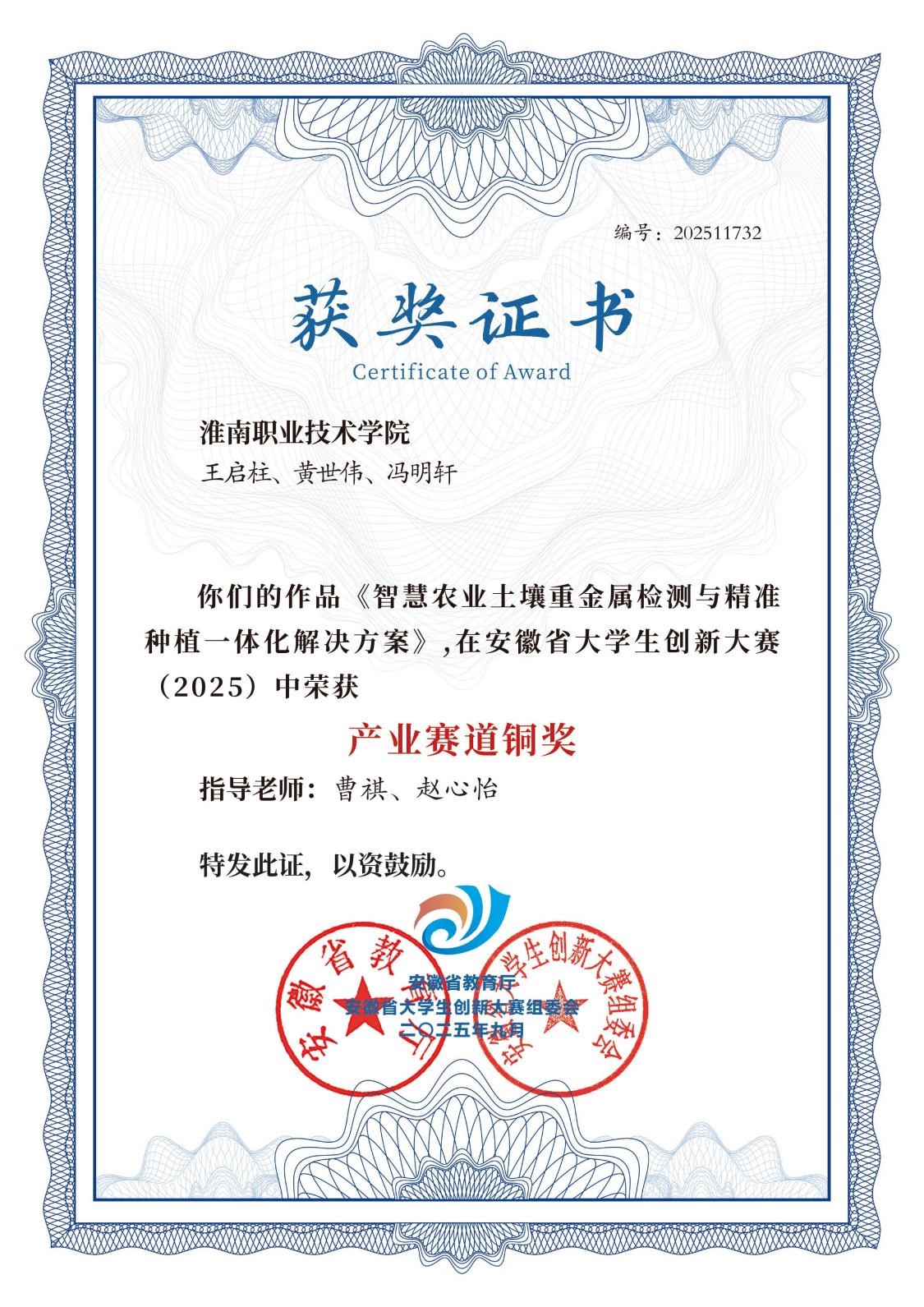 近日,安徽省大学生创新大赛圆满落幕,beat365在线体育官网登录入口学子凭借扎实专业素养与出色实践能力,在大赛激烈竞争中脱颖而出,分别于职教赛道和产业赛道斩获铜奖。安徽省大学生创新大赛前身为安徽省“互联网+”大学生创新创业大赛,是由安徽省教育厅主导的年度性大型赛事,本届大赛吸引了19.8万个项目报名参赛,参赛人数达80万,旨在激发青年学生创新创造热情,提高学生的创新精神、创新意识和创新能力。